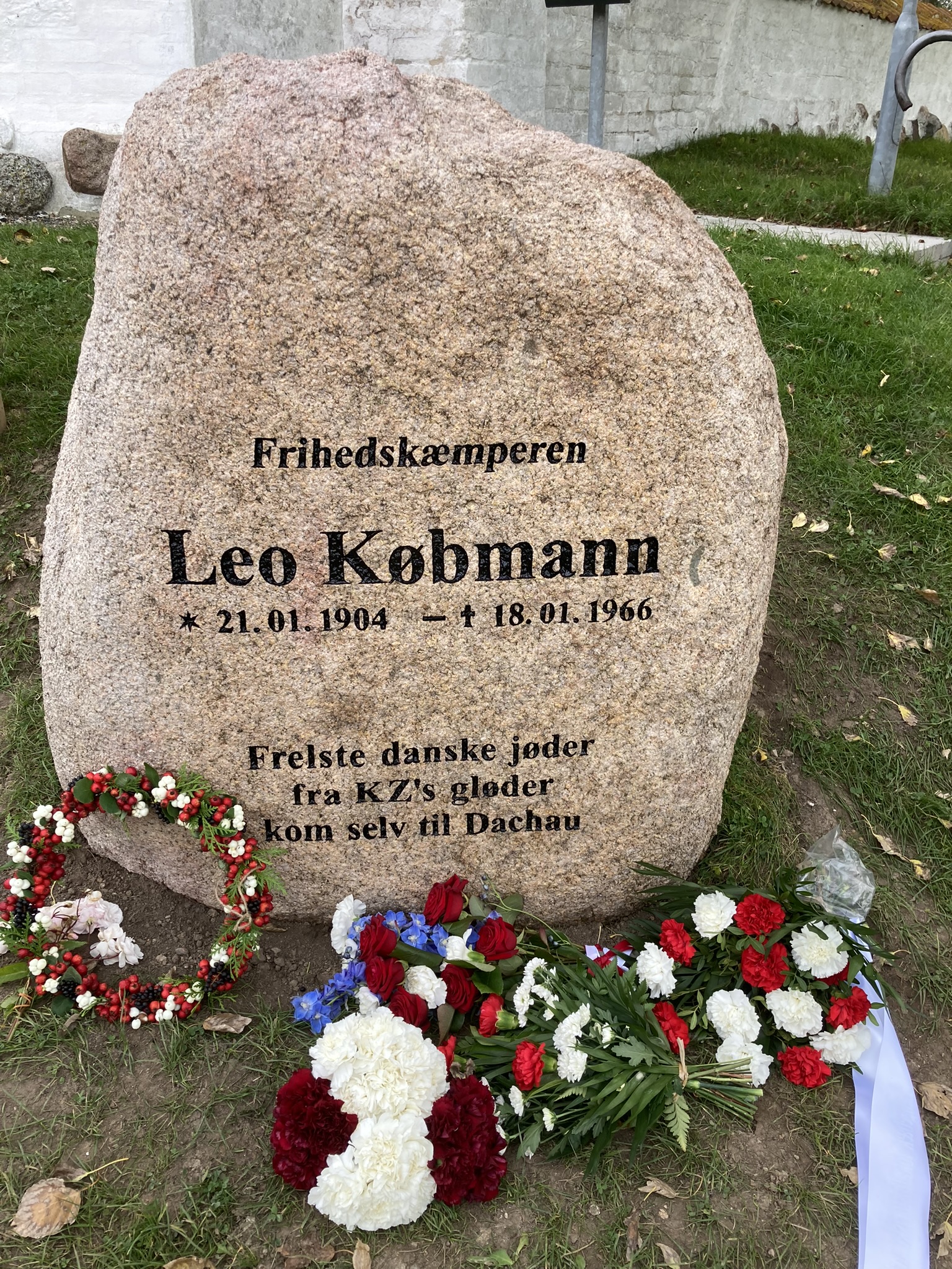 Derfor blev der på 80 årsdagen den 10. oktober 2023, efter en kort højtidelighed her i kirken, rejst en mindesten uden for kirkegårdsmurens nordvestlige hjørne. Den er ment som en forsinket tak for hans indsats og har inskription af forfatteren Johannes Lundstrøm, hvis far var en god ven af Leo Købmann. Stenen er doneret af Petersgaard og stammer fra Vintersbølle skov, tæt ved Vintersbølle Strand, hvorfra de 32 jøder, efter at have været skjult på Petersgaard i nogle dage, kom sikkert til Sverige.